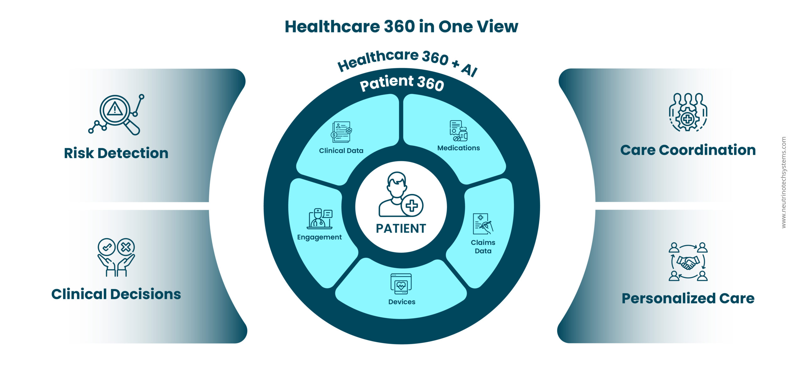 Neutrino’s CareIQ, an AI-powered healthcare accelerator, helps organizations operationalize both Patient 360 and Healthcare 360 by transforming unified patient data into actionable intelligence. By connecting patient management, clinical documentation, medications, lab results, and operational insights into a real time environment, CareIQ enables care teams to identify risks earlier, detect care gaps, and engage patients more proactively across the care journey.